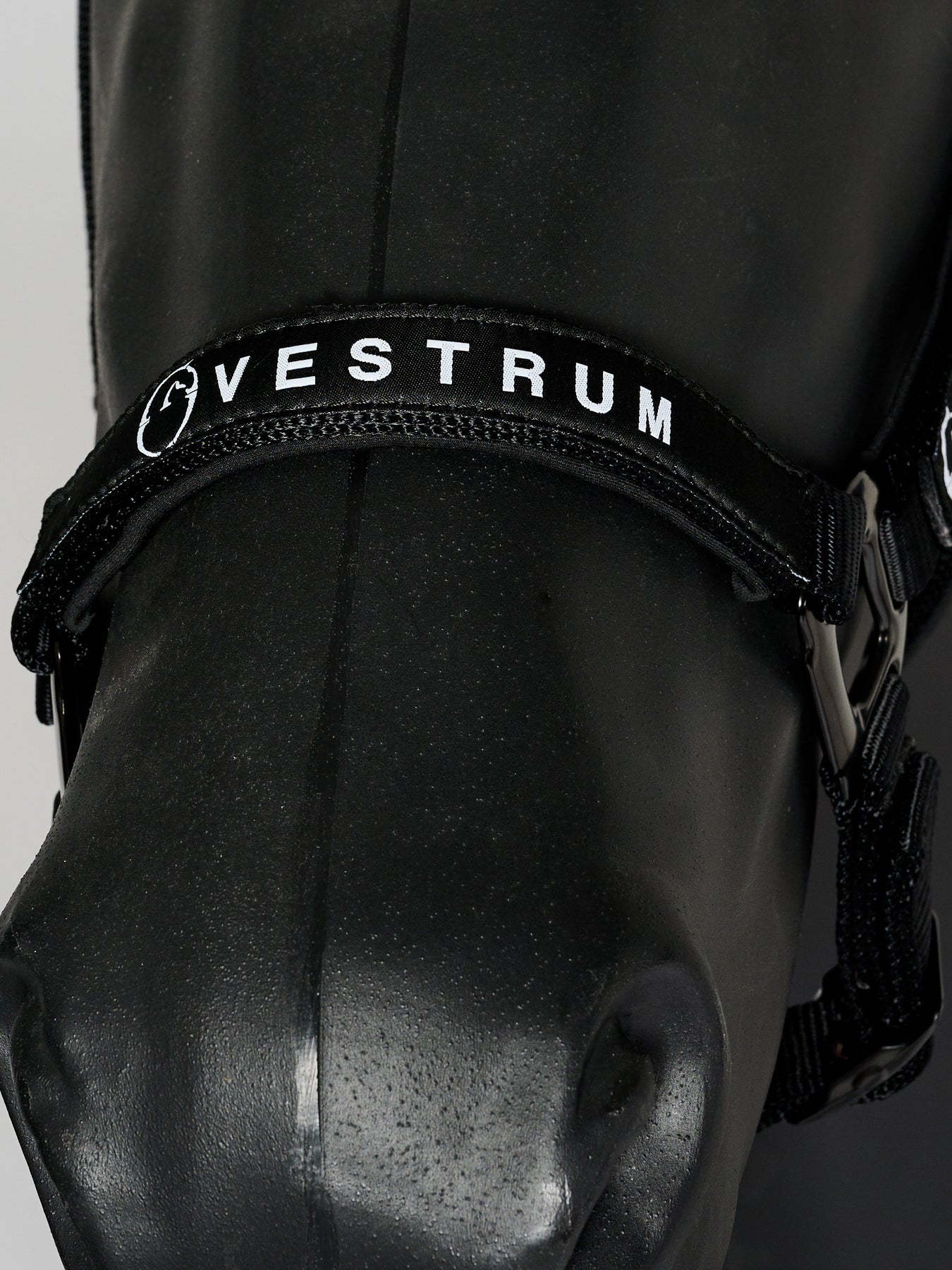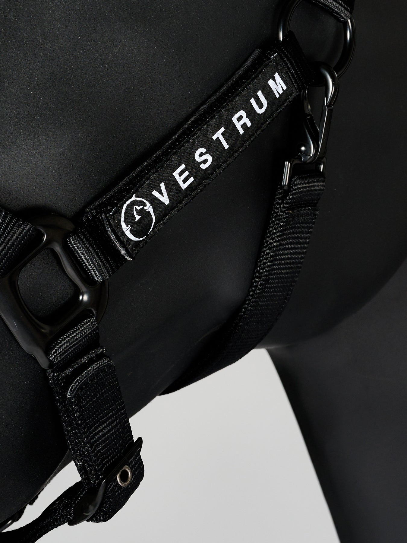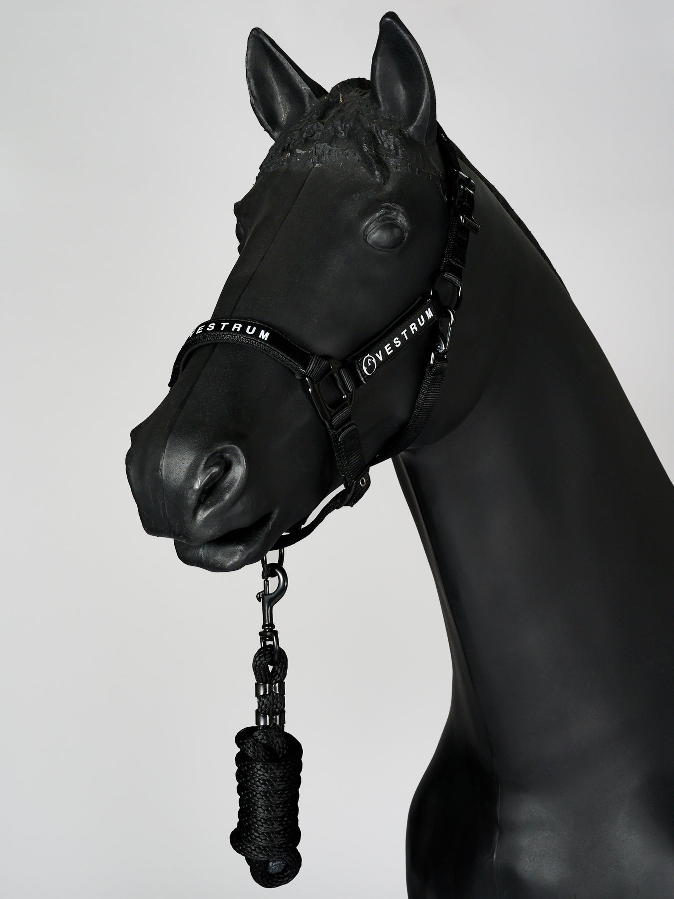 Adjustable Nylon halter characterized by tone-on-tone metal rings. Harness connected to a lead rope.